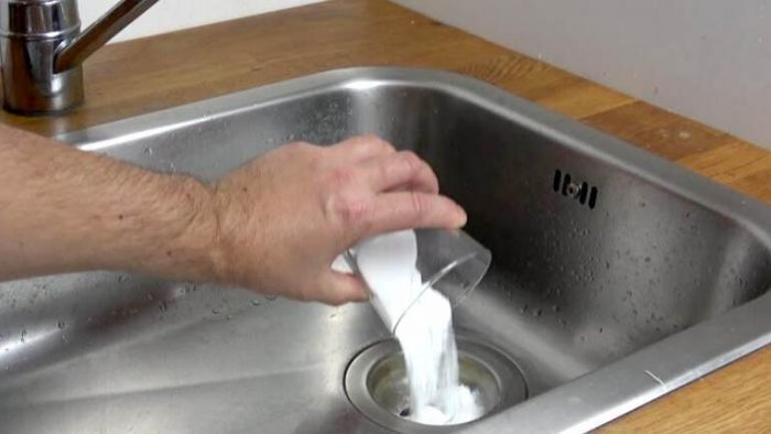 Geben Sie das Backpulver in den verstopften Abfluss und erhitzen Sie das Wasser und den weißen Essig, bis es kocht.