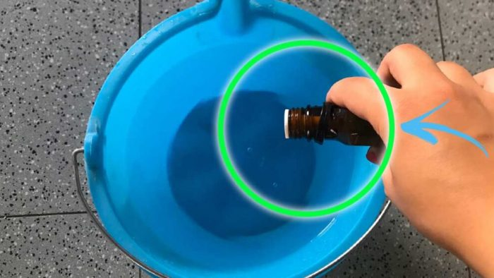 Geben Sie 7/8 Tropfen Ihres bevorzugten ätherischen Öls in den Eimer mit Wasser, Sie werden den Geruch des Bodens wahrnehmen!