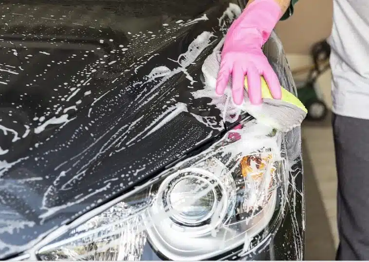 Stellen Sie Ihr Auto für die Karosserie in den Schatten und spritzen Sie es dann mit heißem Wasser ab, um den Staub zu entfernen. Reiben Sie die Karosserie mit einem nicht scheuernden, mit lauwarmem Wasser und Reinigungsmittel angefeuchteten Tuch ab. Spülen Sie das Blech und die Fenster ab und wischen Sie es anschließend mit einem Fensterleder ab, um das Auftreten von Kalkflecken zu vermeiden.