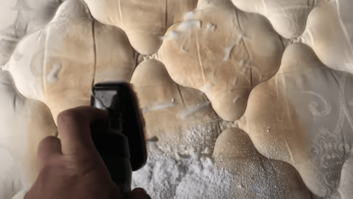 Sobald die Matratze sauber ist, streuen Sie Talkumpuder oder Backpulver direkt darauf. Lassen Sie es einige Stunden einwirken, bevor Sie die Matratze absaugen. Dieser letzte Schritt ist wichtig, Sie müssen sorgfältig saugen, damit keine Rückstände mehr zurückbleiben.