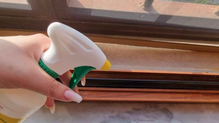 Zunächst ist es wichtig, das Mittel auf die Fensterschienen zu sprühen , um eine natürliche Barriere gegen Insekten zu schaffen. Der Alkohol in der Mischung hilft, den Fensterbereich zu desinfizieren, während der Zimt abweisende Eigenschaften hat, die Insekten abschrecken.