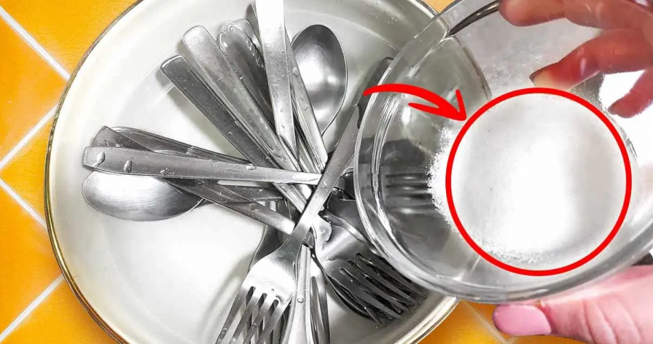 Geben Sie einfach 3 Esslöffel Backpulver in einen Behälter mit heißem Wasser und tauchen Sie Ihr schmutziges Besteck hinein. Einige Stunden einwirken lassen. Anschließend herausnehmen und mit klarem Wasser abspülen. Mit einem Tuch trocknen. Sie werden mit dem Ergebnis zufrieden sein!