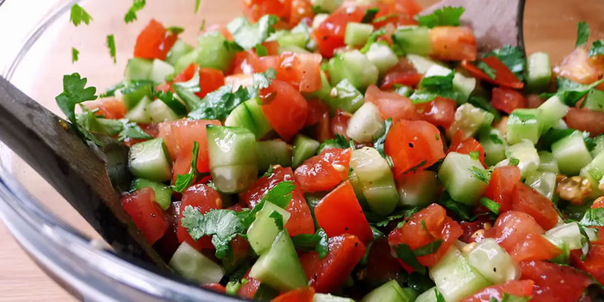 Zutaten: 150 Gramm Kirschtomaten, 40 Gramm rote Zwiebeln, 1 Avocado, 1 Gurke, ein paar Petersilienblätter, natives Olivenöl extra, Essig, ein Stück Feta.