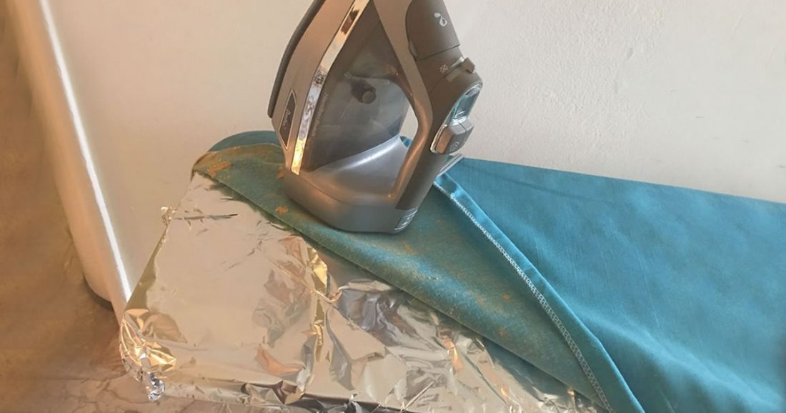 Das Einzige, was Sie tun müssen, ist, den Stoffbezug vom Bügelbrett zu entfernen und ihn mit Aluminiumfolie abzudecken , bis die gesamte Oberfläche bedeckt ist.