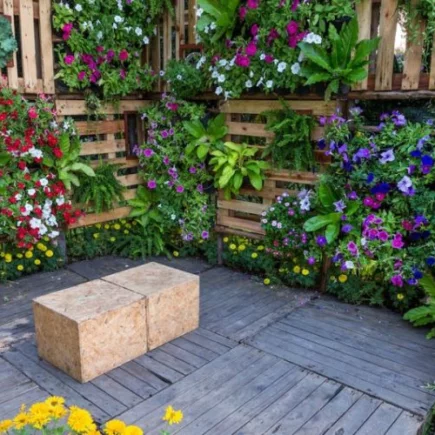 • Bepflanzte Rahmen , bei denen es sich um Holz- (z. B. Paletten) oder Metallkonstruktionen zur Aufnahme von Topfpflanzen handelt. Sie können direkt an der Wand befestigt oder auf einem unabhängigen Träger platziert werden.