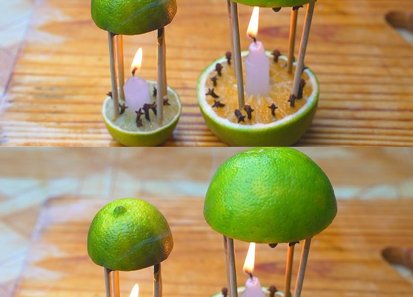Nehmen Sie die große Zitrone, entfernen Sie die Kappe und schneiden Sie sie in zwei Hälften. Stecken Sie die Nelken auf beiden Seiten der Zitrone in das Fruchtfleisch. Legen Sie die beiden mit Nelken angereicherten Zitronen auf den Boden. Schneiden Sie die Kerzen in Stücke und stecken Sie sie in die Mitte der Zitronen. Auf jede Zitronenhälfte vier Bambusstäbchen stecken. Schneiden Sie die kleine Zitrone in zwei Hälften und setzen Sie sie wie eine Kappe auf die Struktur. Zünden Sie die Kerzen an und genießen Sie die Show. Erhitzte Zitronen und Nelken verbreiten einen köstlichen Duft in Ihrem Zuhause. Darüber hinaus wird dieser Duft von den meisten Insekten nicht geschätzt, was dazu führt, dass Mücken in wenigen Sekunden fliehen, weil sie sich über den verbreiteten Duft ärgern.