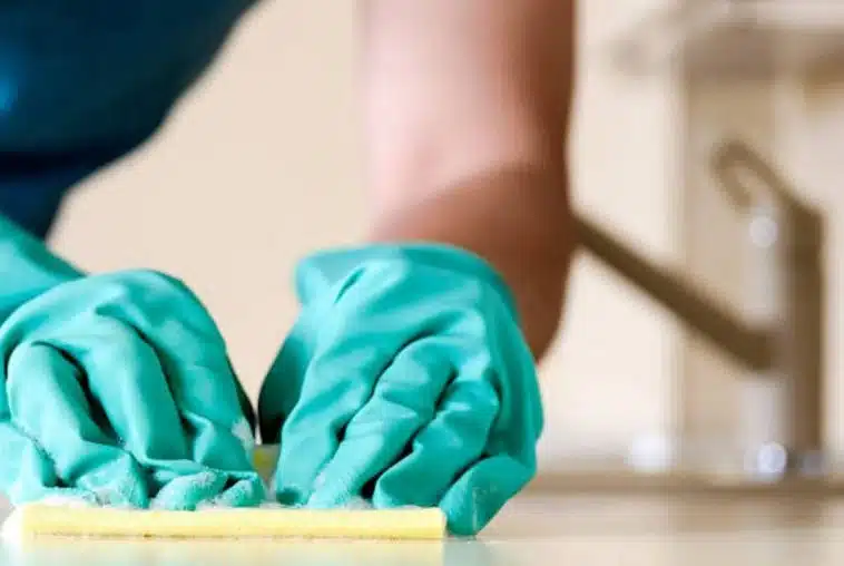 5) Sie können diesen Reiniger in der Badewanne, in der Dusche oder im Waschbecken, auf Fliesen und sogar auf einer Arbeitsplatte verwenden. Durch Reiben mit einem Schwamm oder Tuch und Abspülen.
