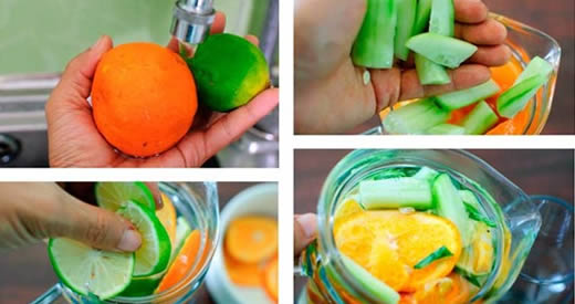 Zutaten: 8 Gläser Wasser, 1 Esslöffel geriebene Ingwerwurzel, 1 frische Gurke in Scheiben geschnitten, 1 Zitrone in Scheiben geschnitten, 12 Minzblätter.