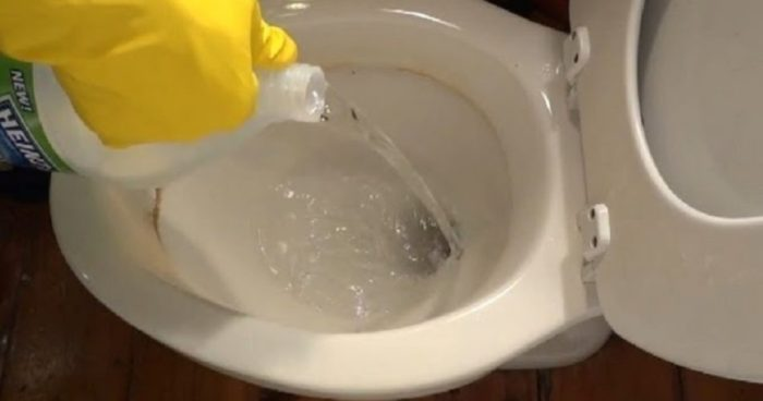 Also spülen wir zuerst die Toilette, dann trocknen wir das gesamte Wasser am Boden des Glases ab und beginnen, eine großzügige Portion weißen Alkoholessig hineinzugießen.