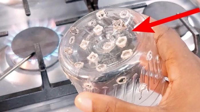 Das erste, was Sie tun müssen, ist, die Plastikflasche zu nehmen und sie in zwei Hälften zu schneiden, sodass nur der Boden übrig bleibt. Nehmen Sie unmittelbar danach den Stempel und erhitzen Sie ihn, um viele kleine Löcher entlang der Kunststoffoberfläche zu erzeugen. Fügen Sie die beiden starken Drähte hinzu, sodass eine Art Korb mit Löchern entsteht.