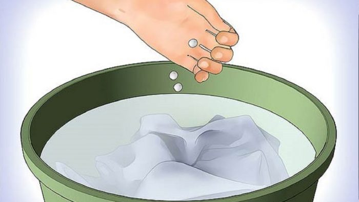Zerstoßen Sie 6 Aspirintabletten, geben Sie sie in eine Schüssel mit Wasser und lassen Sie Ihre Kleidung 30 Minuten lang in der Mischung einweichen. Waschen Sie sie wie gewohnt und der Fleck wird irgendwann verschwinden.