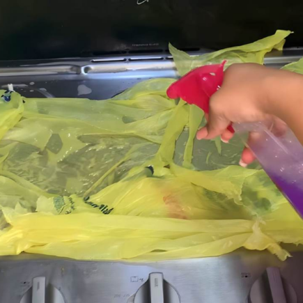 Nehmen Sie in der Zwischenzeit eine Plastiktüte und legen Sie sie in die Gitter des Kochfelds. Stellen Sie den Herd mit den Brennern in einen anderen Beutel und sprühen Sie den zuvor vorbereiteten Entfetter in die Beutel.