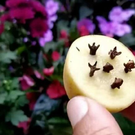 Dazu benötigen Sie Nelken und eine Kartoffel. Während die Kartoffel Nährstoffe enthält, die das Wachstum Ihrer Pflanze anregen, wehren die Nelken alle Parasiten ab, die Ihre Pflanze befallen.