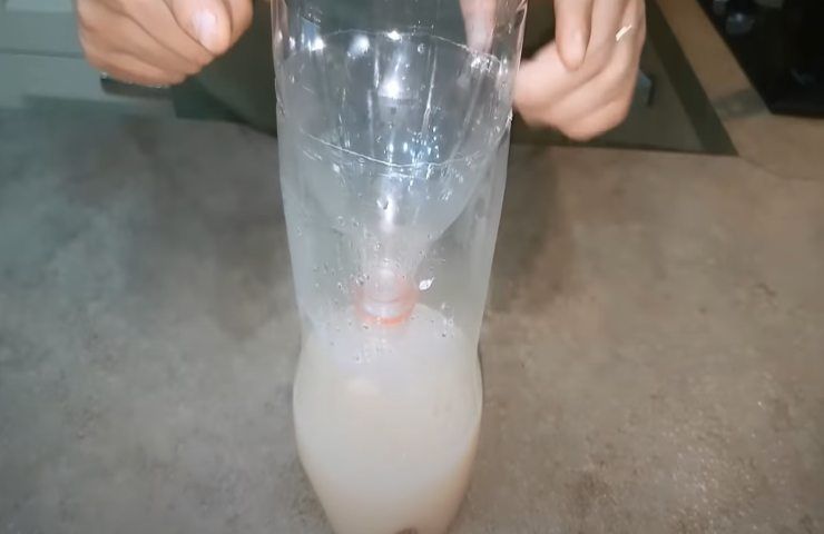 Erhitzen Sie das Wasser in einem Topf und schneiden Sie in der Zwischenzeit die Flasche in zwei Teile, wobei Sie darauf achten, dass der obere Teil kleiner bleibt als der andere. Wenn das Wasser heiß ist, gießen Sie es in den Flaschenboden, fügen Sie den Zucker hinzu und rühren Sie, bis er sich auflöst. Den Hefewürfel dazugeben und vermischen. Die Mischung ist fertig.
