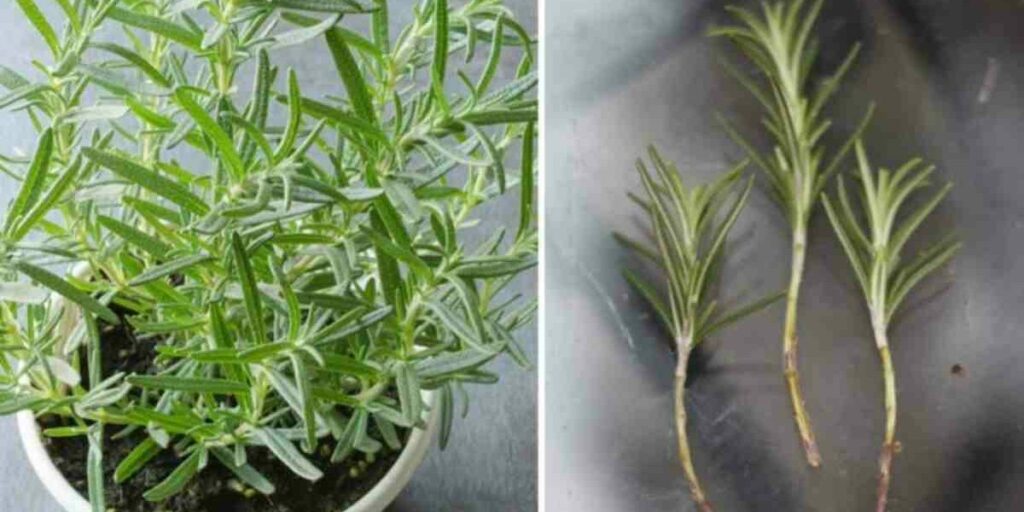 Schneiden Sie 15 Zentimeter diagonal vom Rosmarinzweig ab und entfernen Sie die Blätter an der Basis.