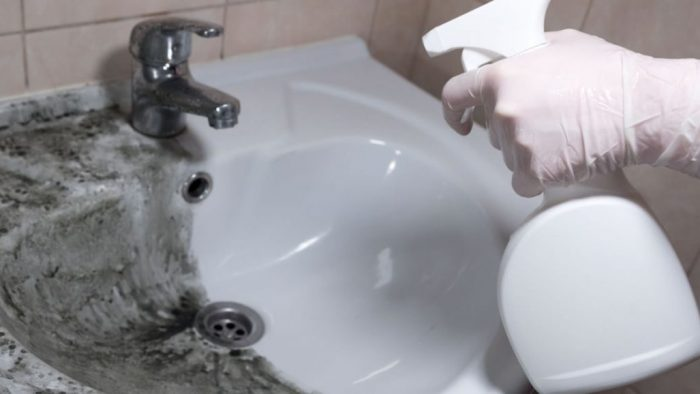 Nach 15 Minuten mit einer Zahnbürste schrubben und mit warmem Wasser abspülen. Der Schimmel sollte sich vollständig lösen. Wenn dies nicht der Fall ist, können Sie die Anwendung des DIY-Antipilzreinigers wiederholen.