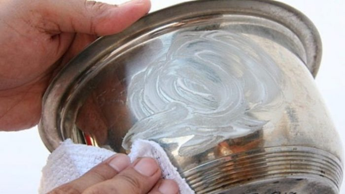 Die beiden Zutaten gut vermischen. Tragen Sie die erhaltene Paste auf die gesamte verschmutzte Oberfläche auf und lassen Sie sie 5 Minuten einwirken. Anschließend den Behälter mit einem weichen Schwamm gut auswaschen.