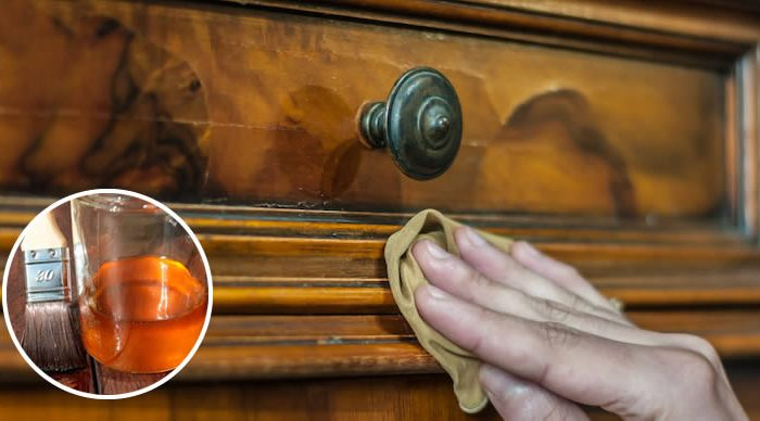 Mischen Sie ein paar Tropfen Olivenöl mit dem Saft einer halben Zitrone und einem Löffel flüssiger Marseille-Seife. Tragen Sie die Mischung direkt auf das Holz auf und verteilen Sie sie mit einem Pinsel auf der gesamten Oberfläche.