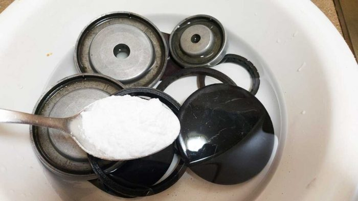 Erhitzen Sie 300 ml Wasser und 700 ml Essig auf dem Herd. Wenn die Mischung kocht, schalten Sie den Herd aus, tauchen Sie das Geschirr und die Brenner ein und lassen Sie es einweichen.