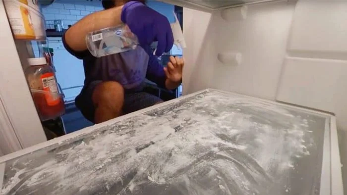 Leeren Sie zunächst natürlich alles aus Ihrem Kühlschrank. Beginnen Sie damit, das Backpulver auf den Regalen des Kühlschranks zu verteilen. Sie können das Backpulver in eine Plastikschüssel gießen und es mit einem Löffel gleichmäßig verteilen. Sie können es auch mit den Händen weiter verteilen, tragen Sie in diesem Fall jedoch unbedingt Handschuhe.