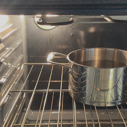 Füllen Sie den Topf mit Wasser , gießen Sie dann ein halbes Glas Essig und den Saft einer Zitrone hinein . Der Dampf dieser Lösung hilft dabei, den Ofen zu entkalken und schlechte Gerüche zu neutralisieren .