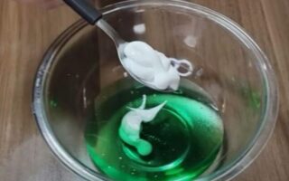 Mischen Sie in einer ausreichend großen Schüssel die Seife mit Essig und Backpulver. Sobald die Brausereaktion abgeschlossen ist, den Zitronensaft hinzufügen und gut vermischen.