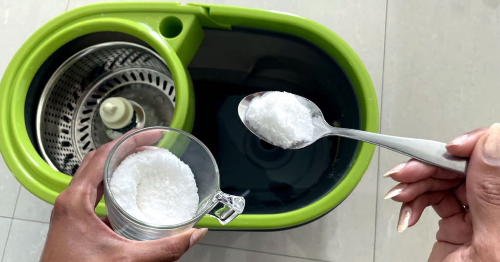 Lösen Sie einfach etwa 200 Gramm Natron in einem mit warmem Wasser gefüllten Eimer auf und reinigen Sie mit einem Tuch die gesamte Bodenfläche.