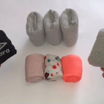 Das Ergebnis kann sich sehen lassen: Mit wenigen Handgriffen wurden die beiden Socken perfekt gefaltet und auf eine platzsparende Größe verkleinert. Aber was wäre, wenn wir stattdessen ein Paar kürzere Socken, auch „Geister“ genannt, hätten? Auch dieser Vorgang beginnt wie der vorherige, das heißt, man nimmt die Fersen und beugt sie. Anschließend nimmst du den unteren Rand der Socken und faltest ihn, bis er fast die Mitte erreicht.
