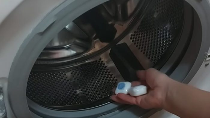 Um die Waschmaschine zu reinigen, legen Sie einfach ein paar    Spülmaschinentabs in den Korb.