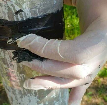Wickeln Sie den Stamm des Baumes mit Plastikfolie ein . Denken Sie daran, die Küchenfolie regelmäßig auszutauschen. Es sind nur 2 bis 3 Schichten erforderlich, um den Baumstamm gut auszukleiden. Dank dieser einfachen und kostengünstigen Technik trauen sich die Ameisen nicht, sich der Baumrinde zu nähern.
