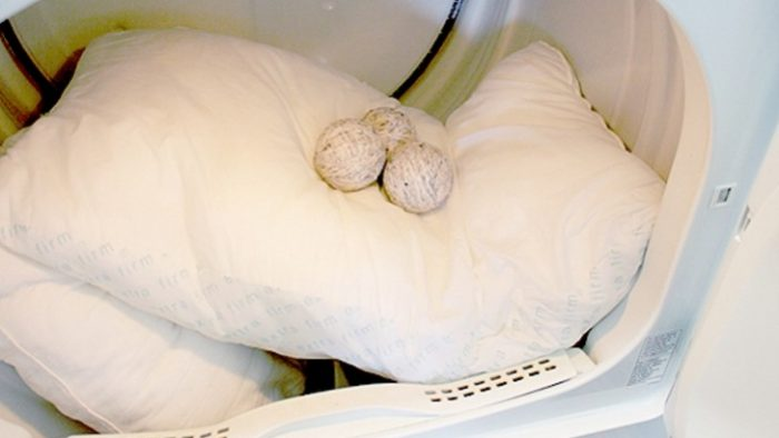 Zum Trocknen der Kissen können Sie den Trockner nutzen oder sie bei starker Sonneneinstrahlung draußen aufhängen. Im ersten Fall legen Sie mit sauberen weißen Socken bedeckte Tennisbälle oder Trocknerbälle in den Trockner.