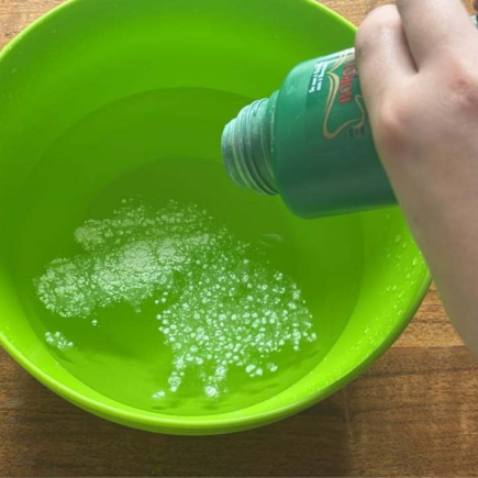 Das warme Wasser beschleunigt den Auflösungsprozess des Talkumpuders im Behälter. Mischen Sie nun einfach die Lösung, bis sich das Talkumpuder vollständig im Wasser auflöst.