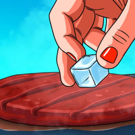 Der Trick mag ungewöhnlich erscheinen, aber einen Versuch ist er auf jeden Fall wert. Der Eiswürfel auf dem Fleischstück verhindert, dass es von außen braun wird, und verzögert das Garen von innen, wodurch es saftiger und schmackhafter bleibt.