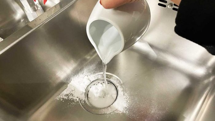 Alles, was Sie tun müssen, ist, zunächst eine Tasse Backpulver in den Abfluss zu schütten. Warten Sie dann ein paar Sekunden, bis das Natron verdunstet ist, und gießen Sie eine Tasse Essig hinein.