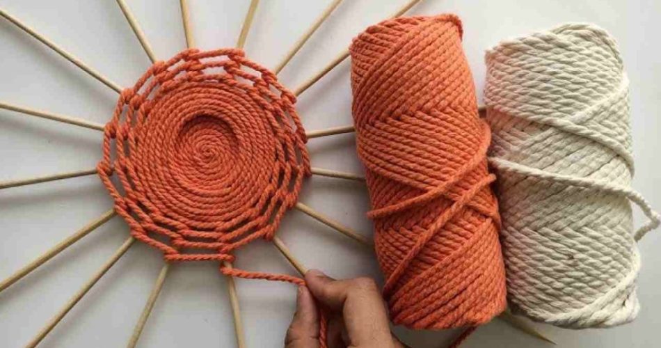 Drehen wir diese letzte Kreation um und rollen wir etwas Faden auf, um ihn in der Mitte des Pappkreises zu befestigen, der als Basis dient. Wir wickeln den Draht weiterhin mit der Klebepistole auf , bis die Kreation vollständig ausgefüllt ist.