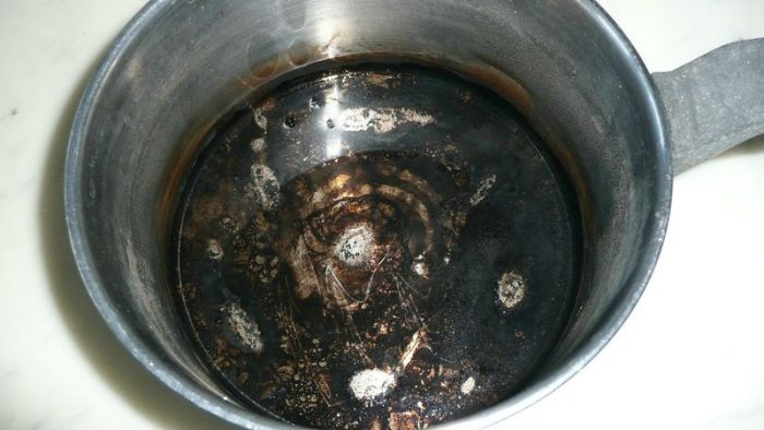 Nehmen Sie zunächst etwas Backpulver und verteilen Sie es auf dem Boden der Pfanne. Konzentrieren Sie sich auf die schmutzigsten Orte. Dann etwa 2 cm Wasser hinzufügen und erhitzen, bis es kocht. Lassen Sie es etwa fünfzehn Minuten einwirken. Abschließend mit Flüssigwaschmittel reinigen und normal ausspülen.