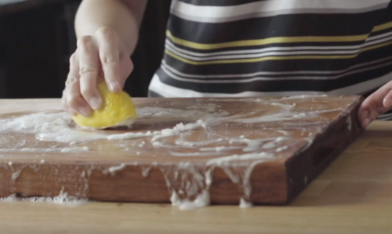 Manchmal sind auf dem Holzbrett Flecken von getrockneten Lebensmitteln festgeklebt. Kurz gesagt: Reinigen ist nicht immer eine leichte Aufgabe! Für eine gründliche Reinigung geben Sie einen Haufen feines oder grobes Salz in die Mitte des Bretts und kneten es mit einer halben Zitrone als Schwamm! Für eine sanftere Reinigung können Sie auch eine halbe Zitrone allein verwenden. Darüber hinaus vertreibt es schlechte Gerüche. Besser noch: Indem Sie den Saft einer Zitrone hineingießen und eine gute Viertelstunde einwirken lassen, können Sie das Holzbrett sehr effektiv desinfizieren.